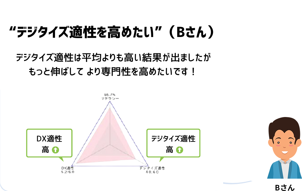 「DX適性」と「デジタイズ適性」はそれぞれ6分野あり、平均値が高いほど「適性あり」と判断されます。「リテラシー」は3分野あり、正答率が高いほど「リテラシーが高い」と判断されます。