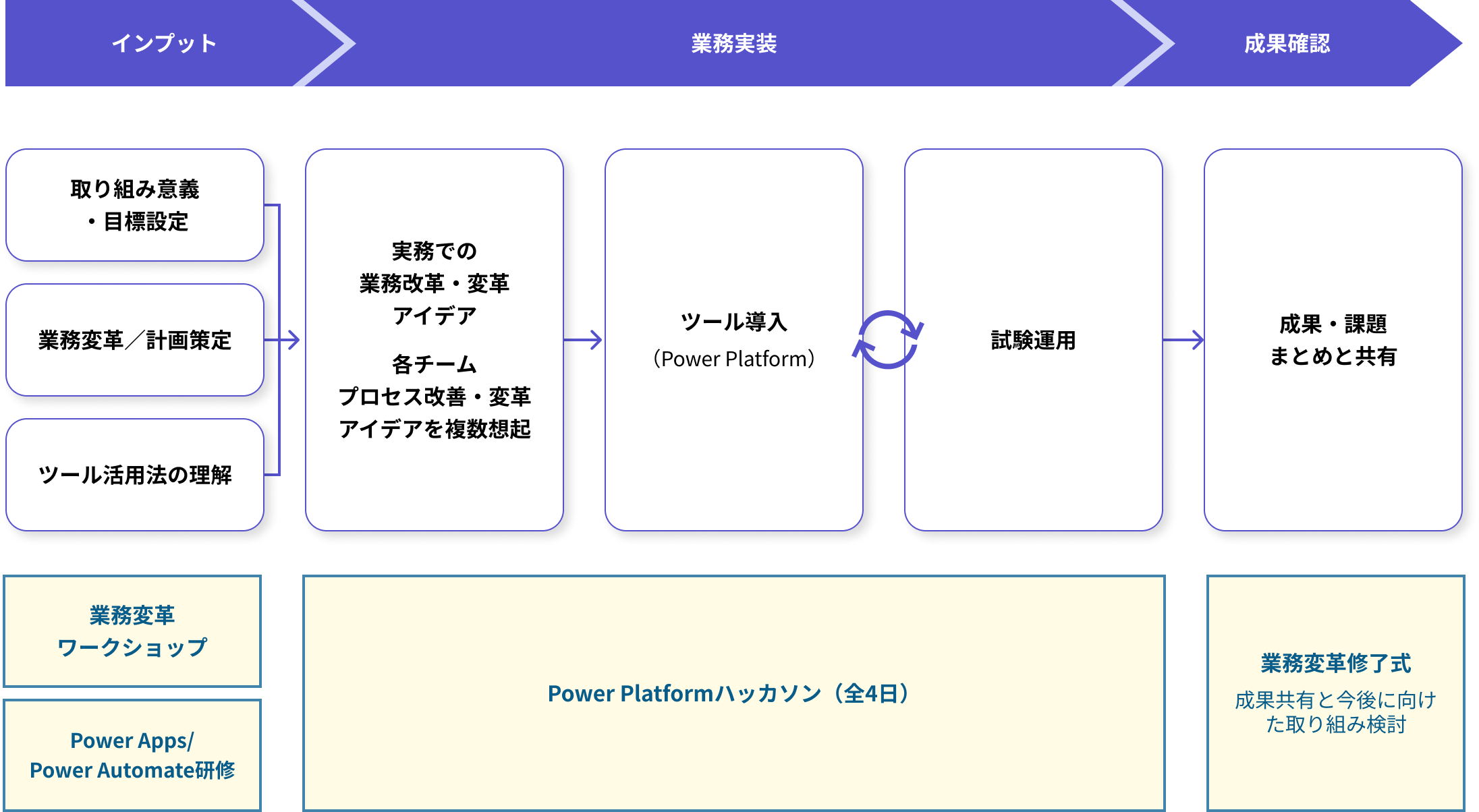 業務の目的設定から構想、実装、成果確認までを一気通貫で行う実践型の業務変革プログラム例。