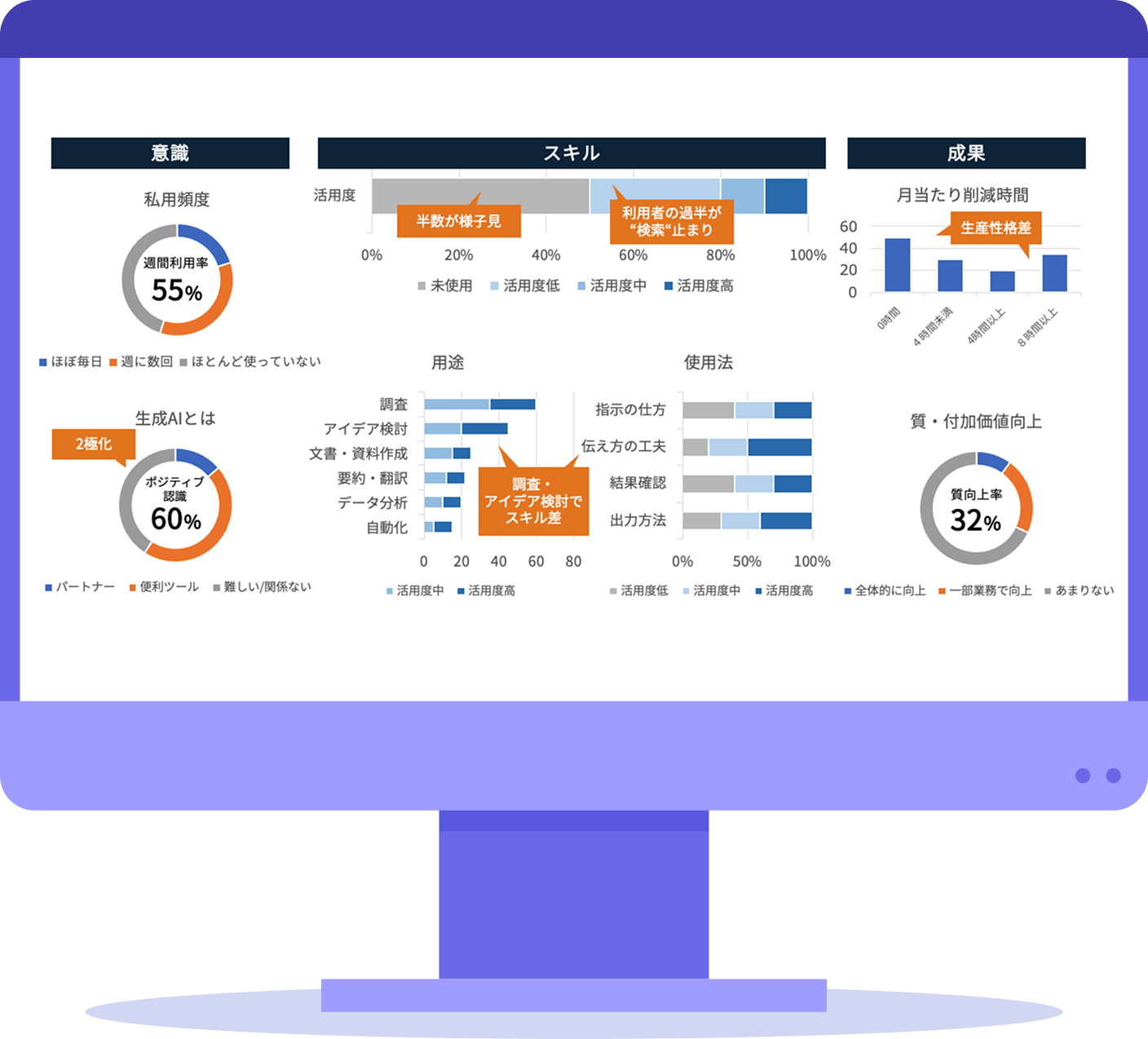 利用頻度、用途、使い方、成果といった観点から、社員一人ひとりの活用状況を把握できます。単なる「利用率」では見えない活用の程度を可視化し、次に打つべき施策検討に活かせます。