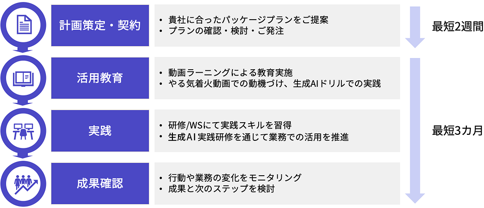 単発研修ではなく、現状把握から活用教育、定着支援まで一気通貫で支援する点が特長です。また、活用度の可視化を通じて成果を確認しながら、施策を改善できる点が大きな違いです。