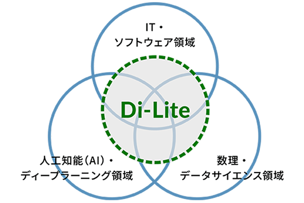 「Di-lite」は、IT・ソフトウェア領域に、デジタル時代、産業界において重要さが高まる「データ×AI」活用に関連した数理・データサイエンス、AI・ディープラーニング領域を加えた領域の基礎領域から、共通リテラシー領域を定義しています。