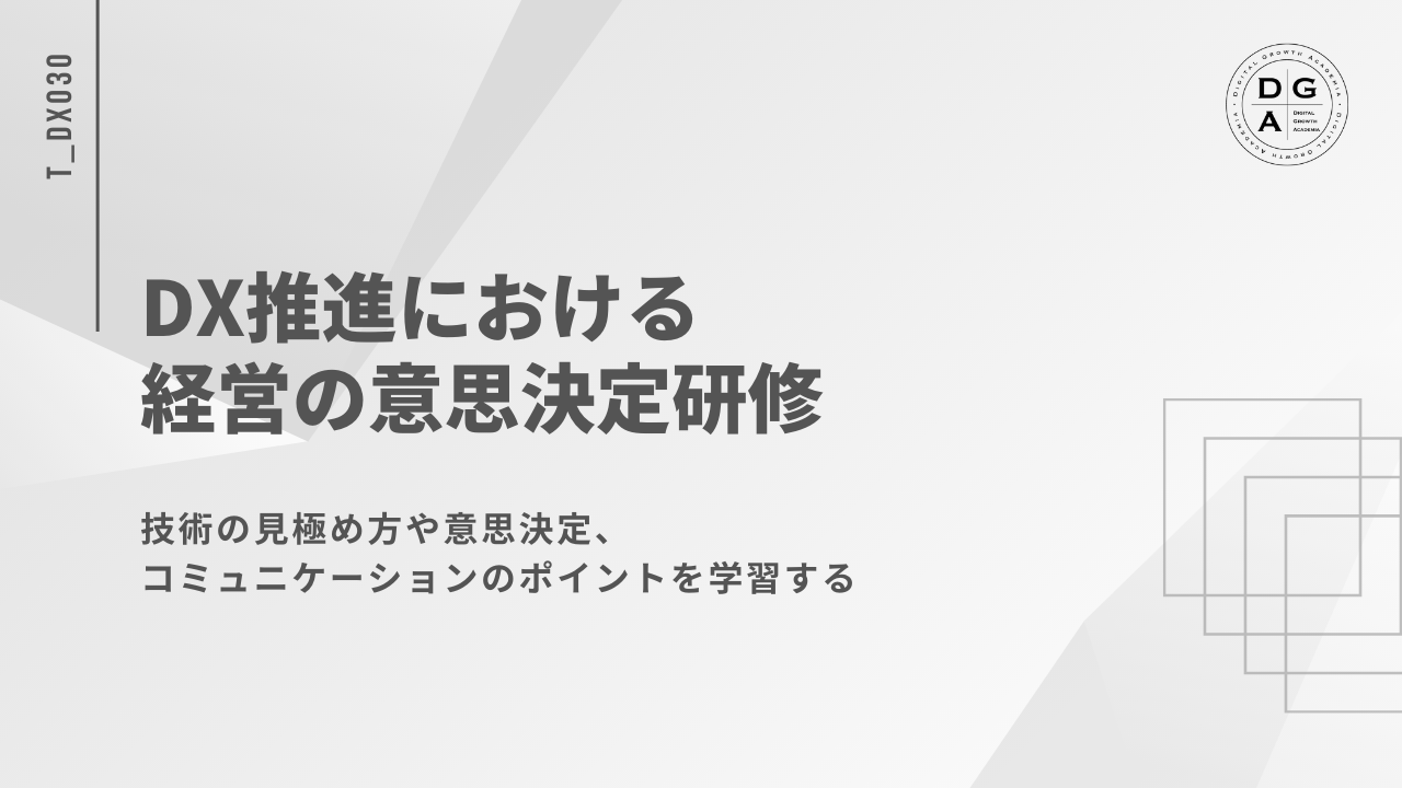 - DX時代のリーダーとして、技術の見極め方、DXにおけるコミュニケーションのポイントや意思決定観点を正しく把握しましょう